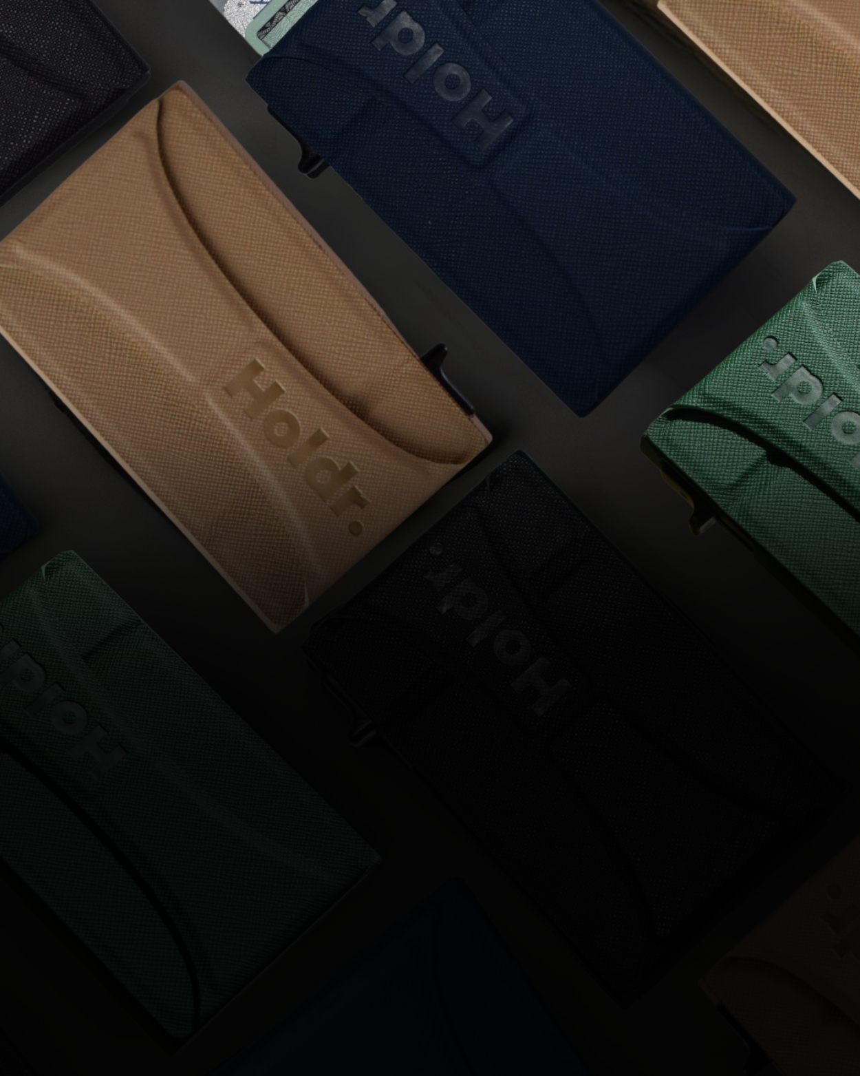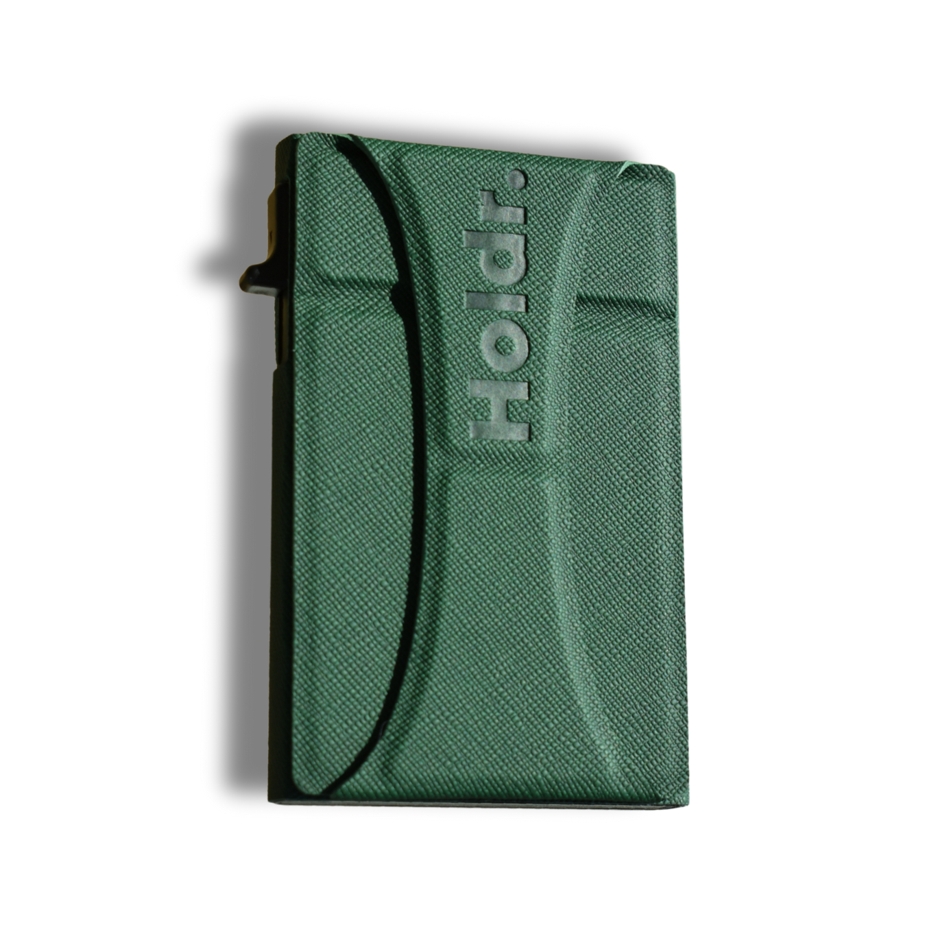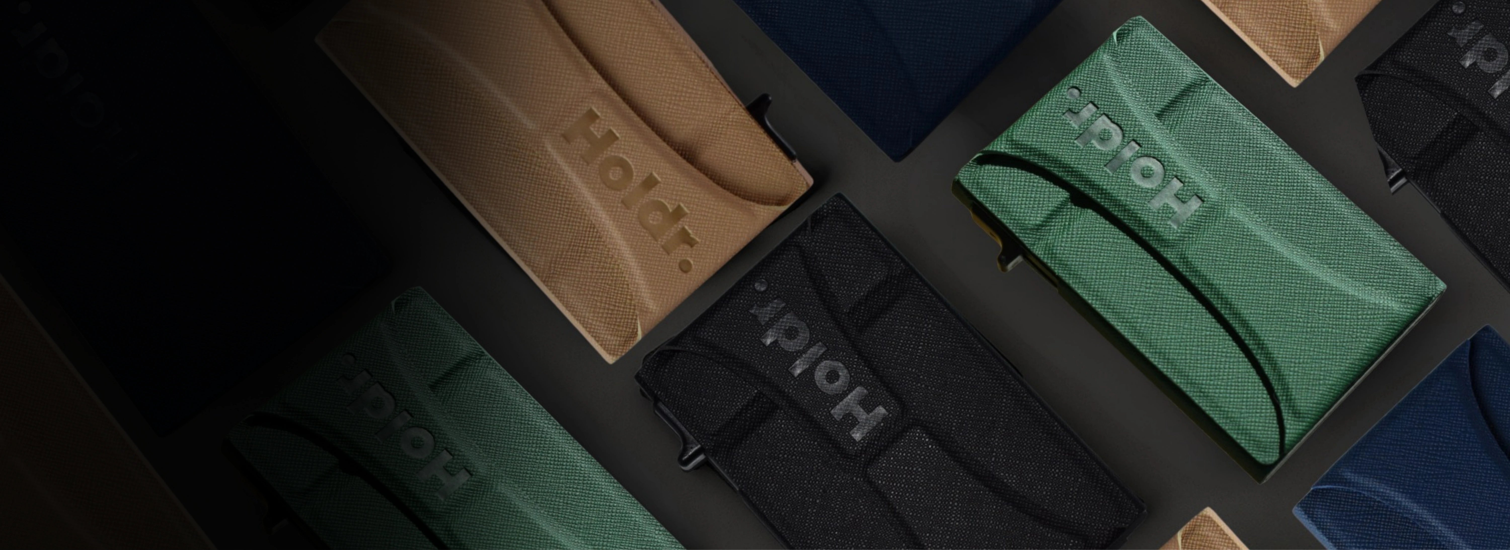 Holdr holds 6-8 cards (credit cards, IDs) in a slim, lightweight design for easy access without bulk.